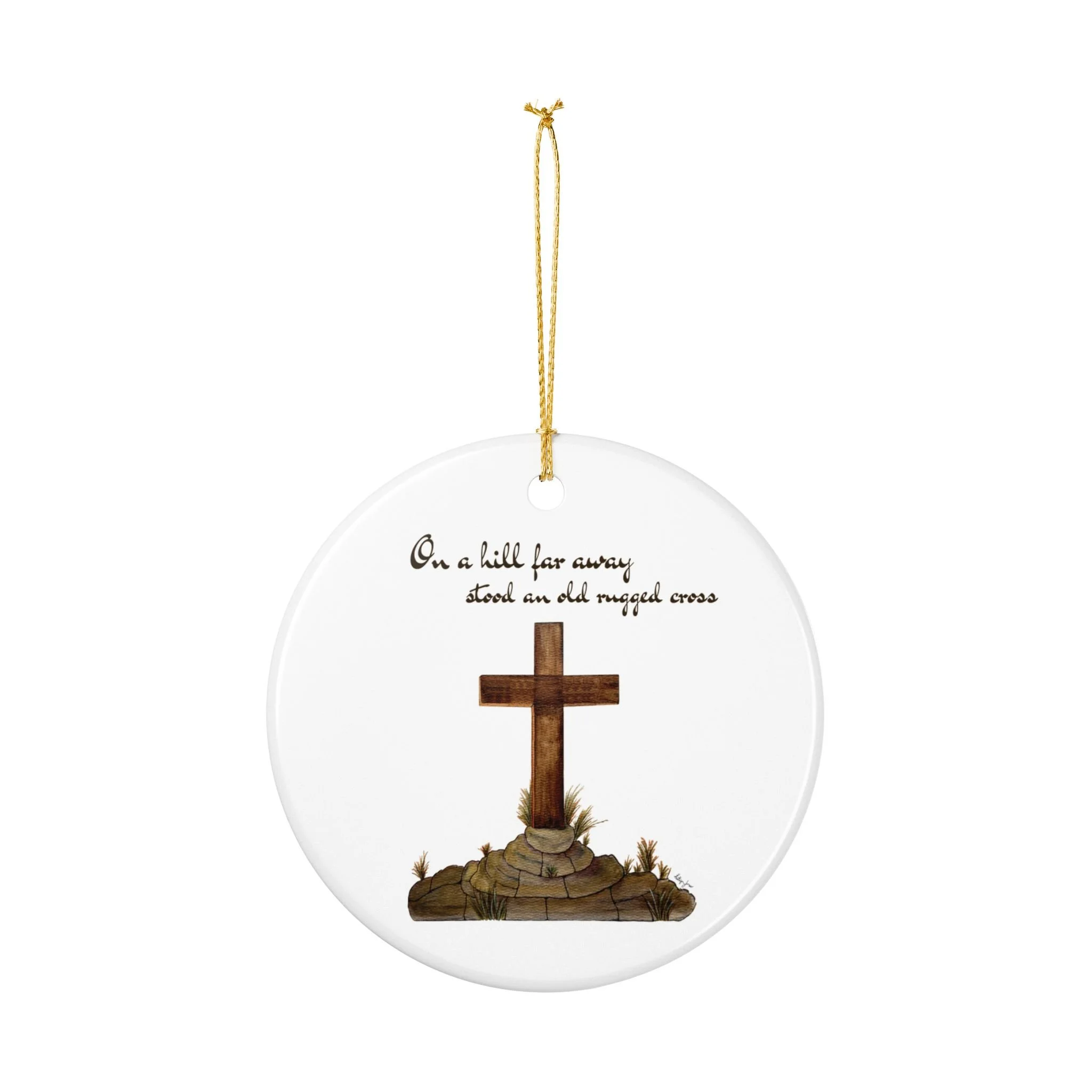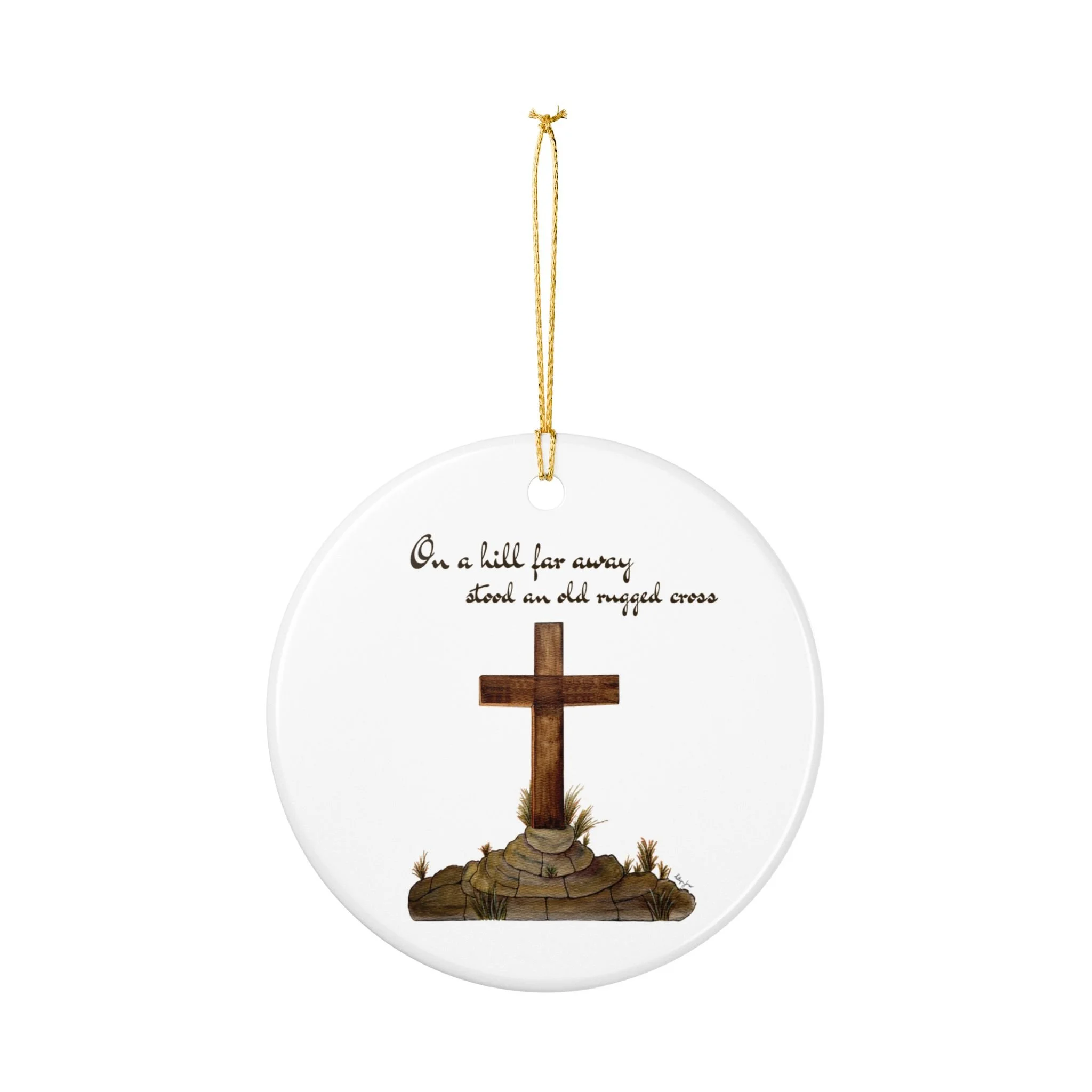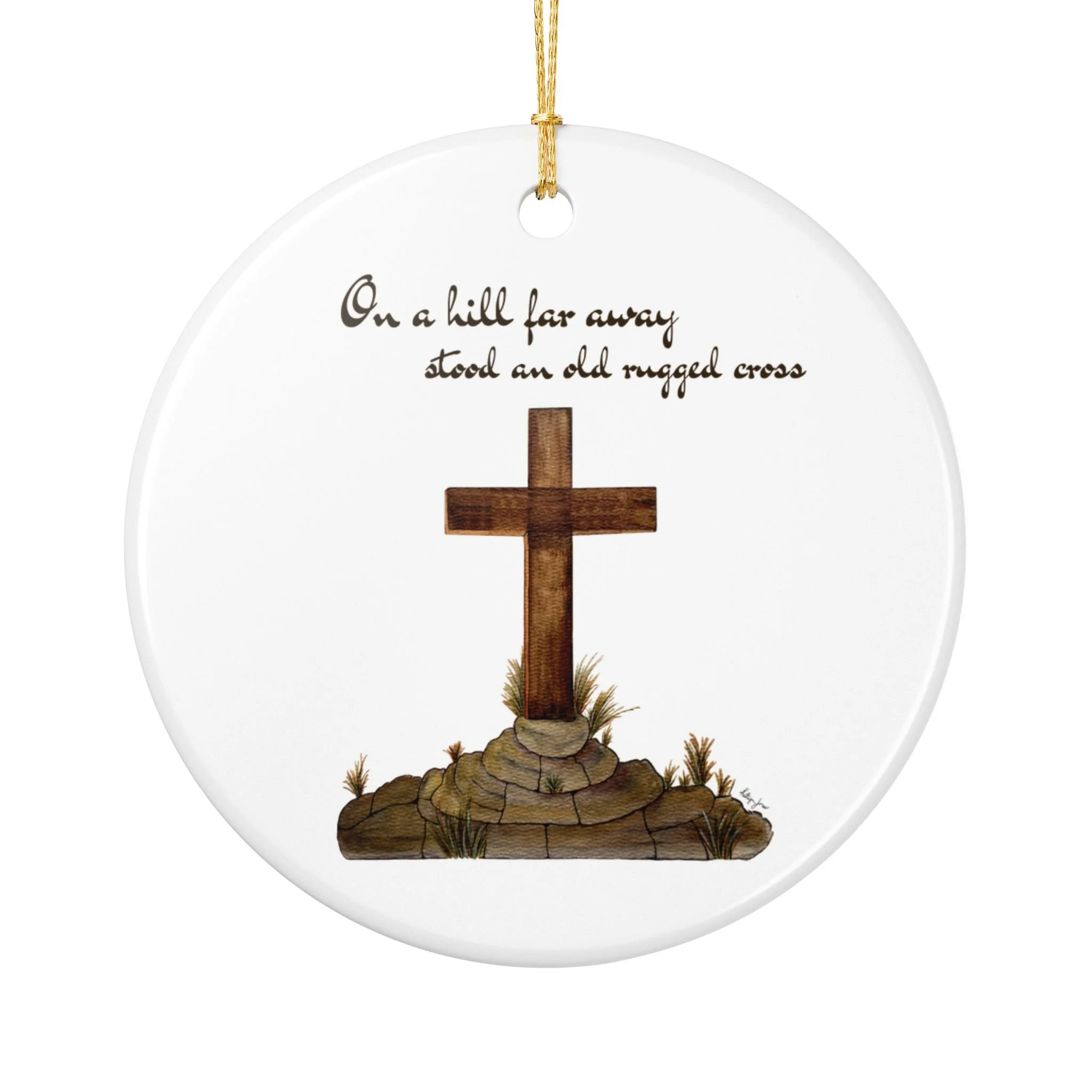 Hand-painted simplicity meets quiet devotion. This ceramic ornament shows a weathered wooden cross resting on a small mound of stones and grasses, with the tender line "On a hill far away stood an old rugged cross" above it. It hangs from a bright gold string that catches the light and draws the eye, turning a plain branch or mantel into a soft, reflective moment. Light and unassuming, it brings a calm, contemplative presence to a room — a small reminder of faith tucked into everyday holiday decor, an accent for church gatherings, or a keepsake for those who treasure hymn-based traditions.