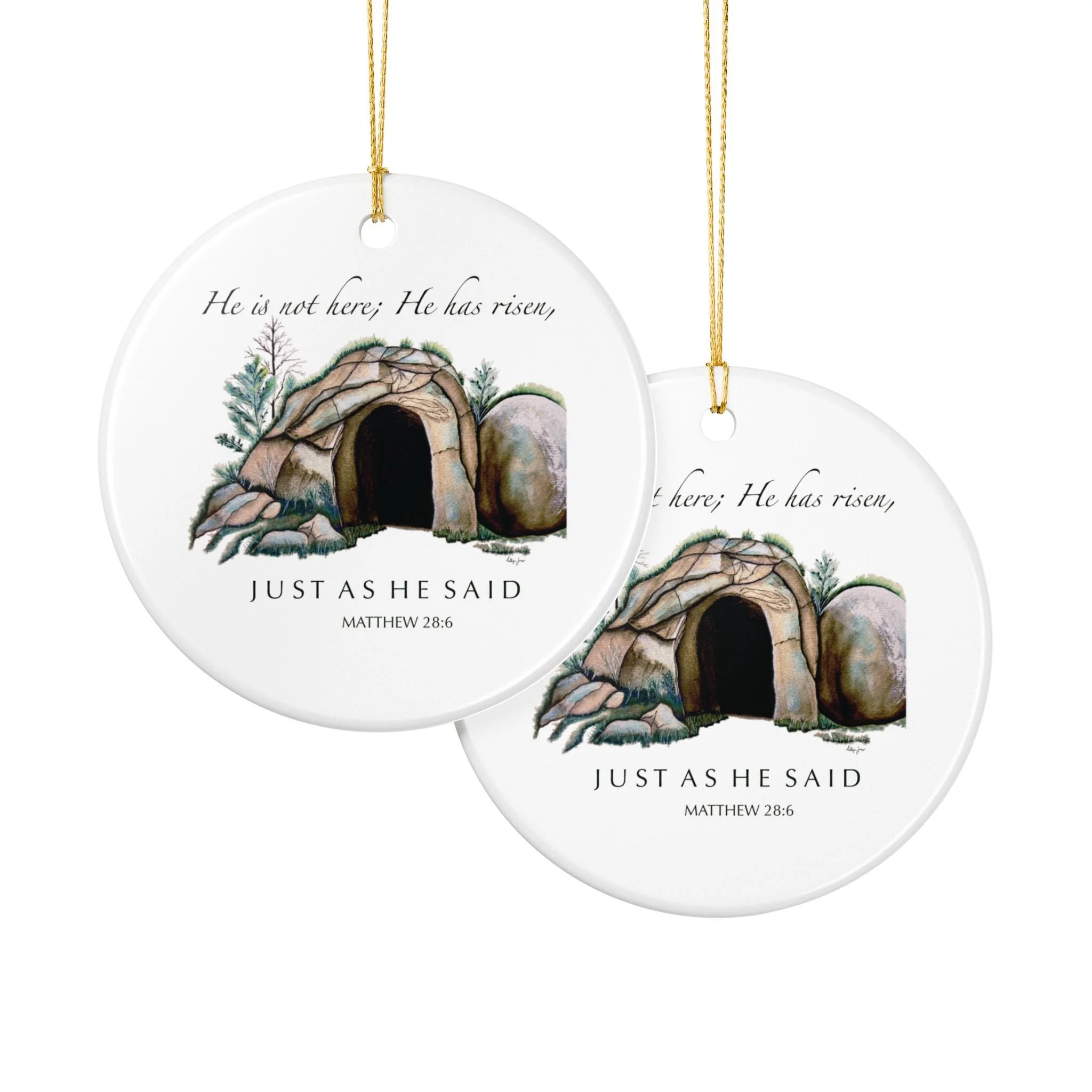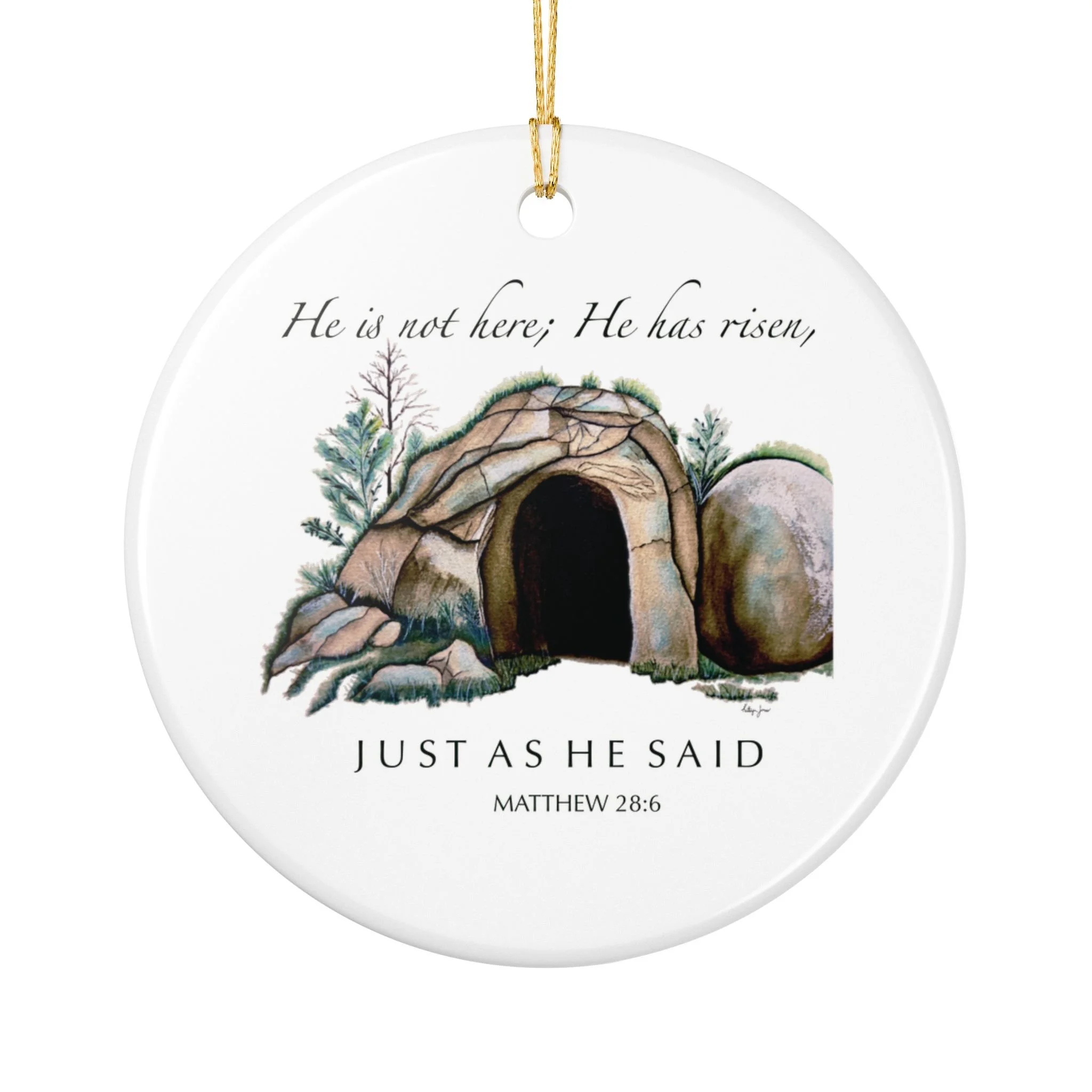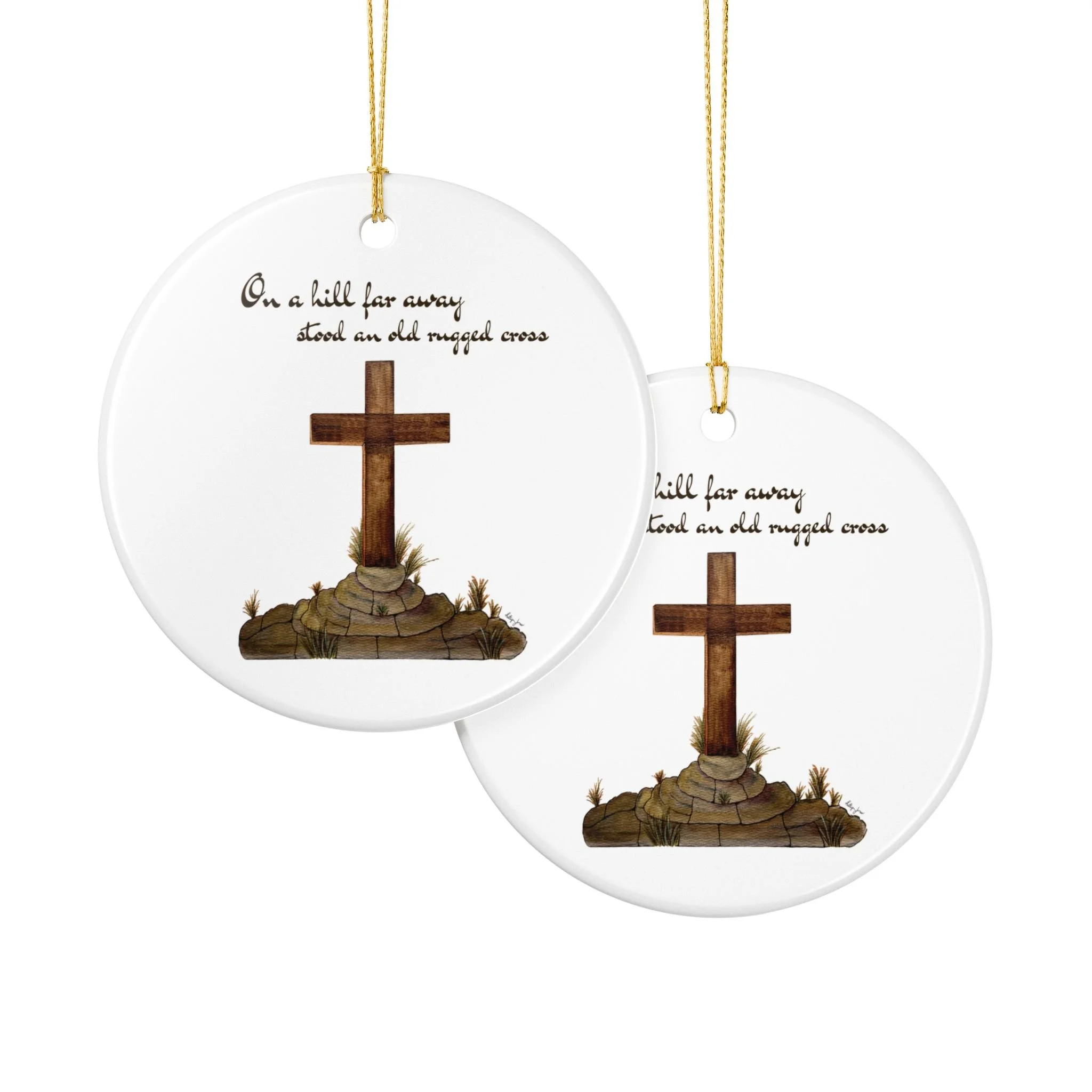 Hand-painted simplicity meets quiet devotion. This ceramic ornament shows a weathered wooden cross resting on a small mound of stones and grasses, with the tender line "On a hill far away stood an old rugged cross" above it. It hangs from a bright gold string that catches the light and draws the eye, turning a plain branch or mantel into a soft, reflective moment. Light and unassuming, it brings a calm, contemplative presence to a room — a small reminder of faith tucked into everyday holiday decor, an accent for church gatherings, or a keepsake for those who treasure hymn-based traditions.