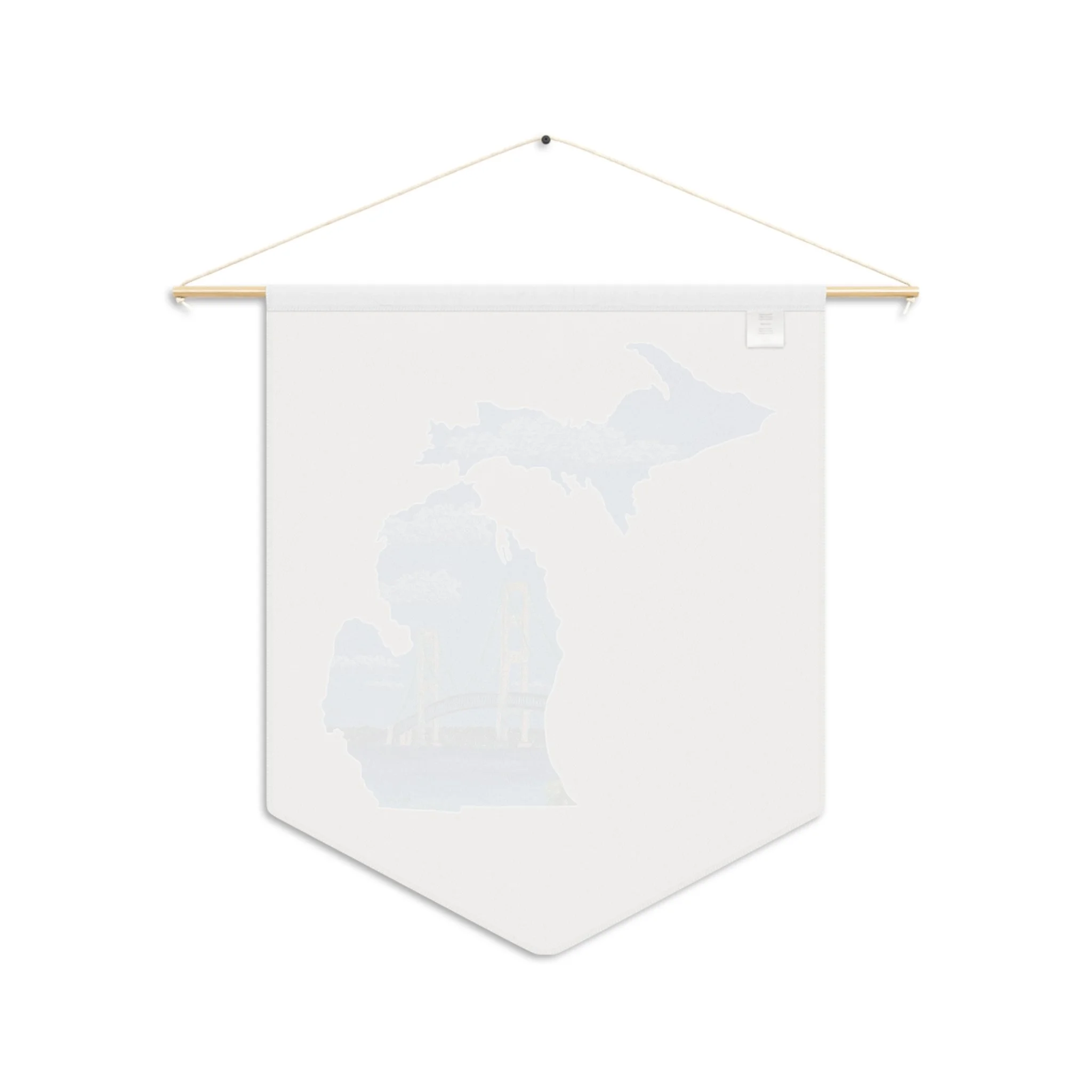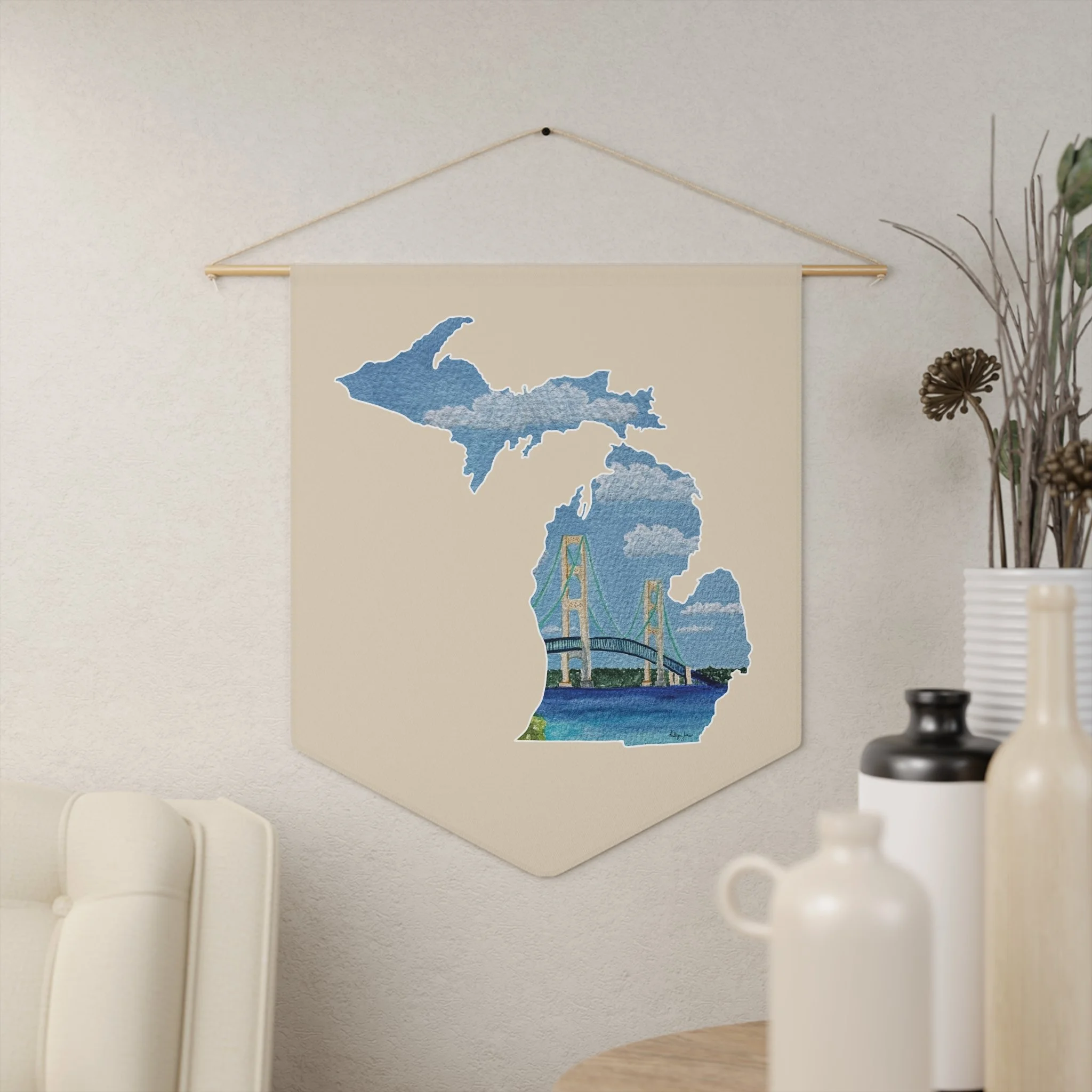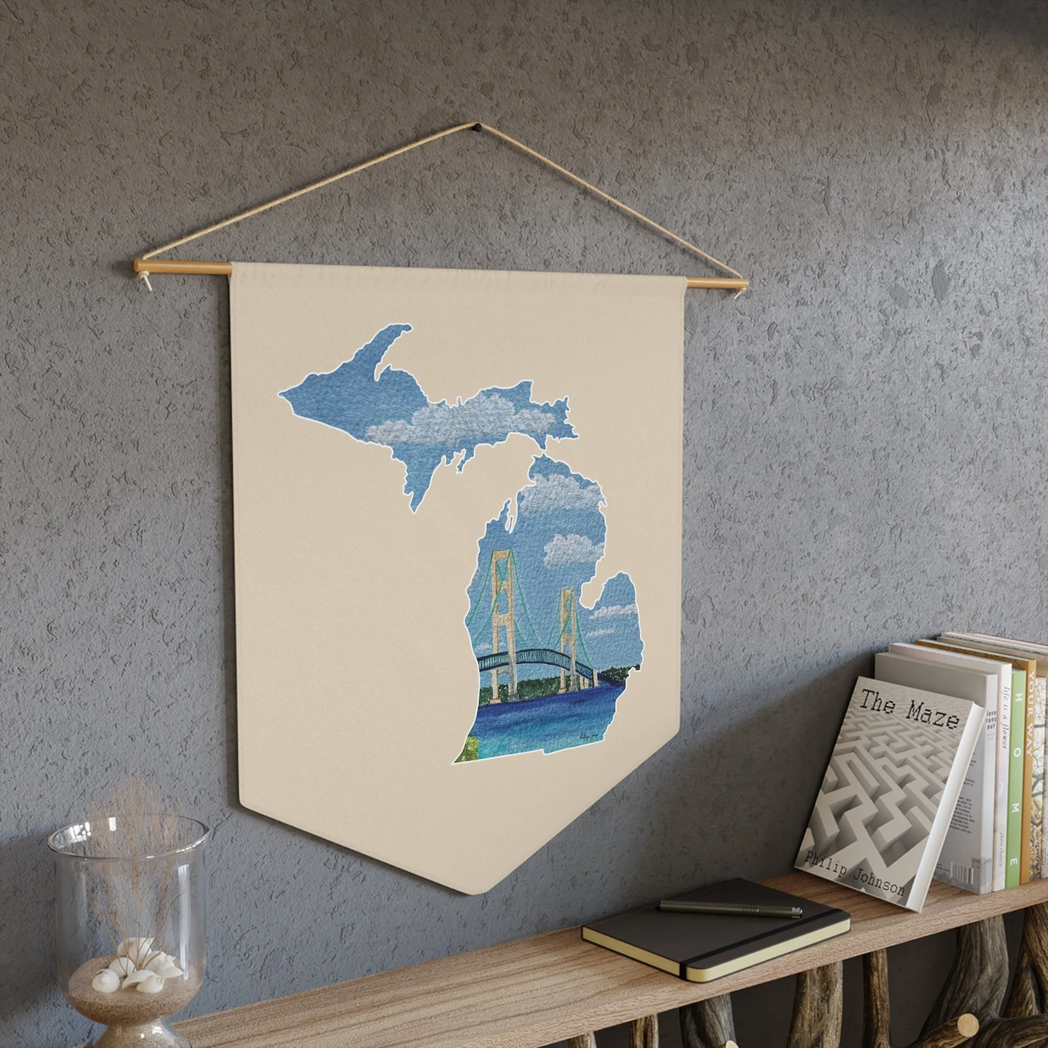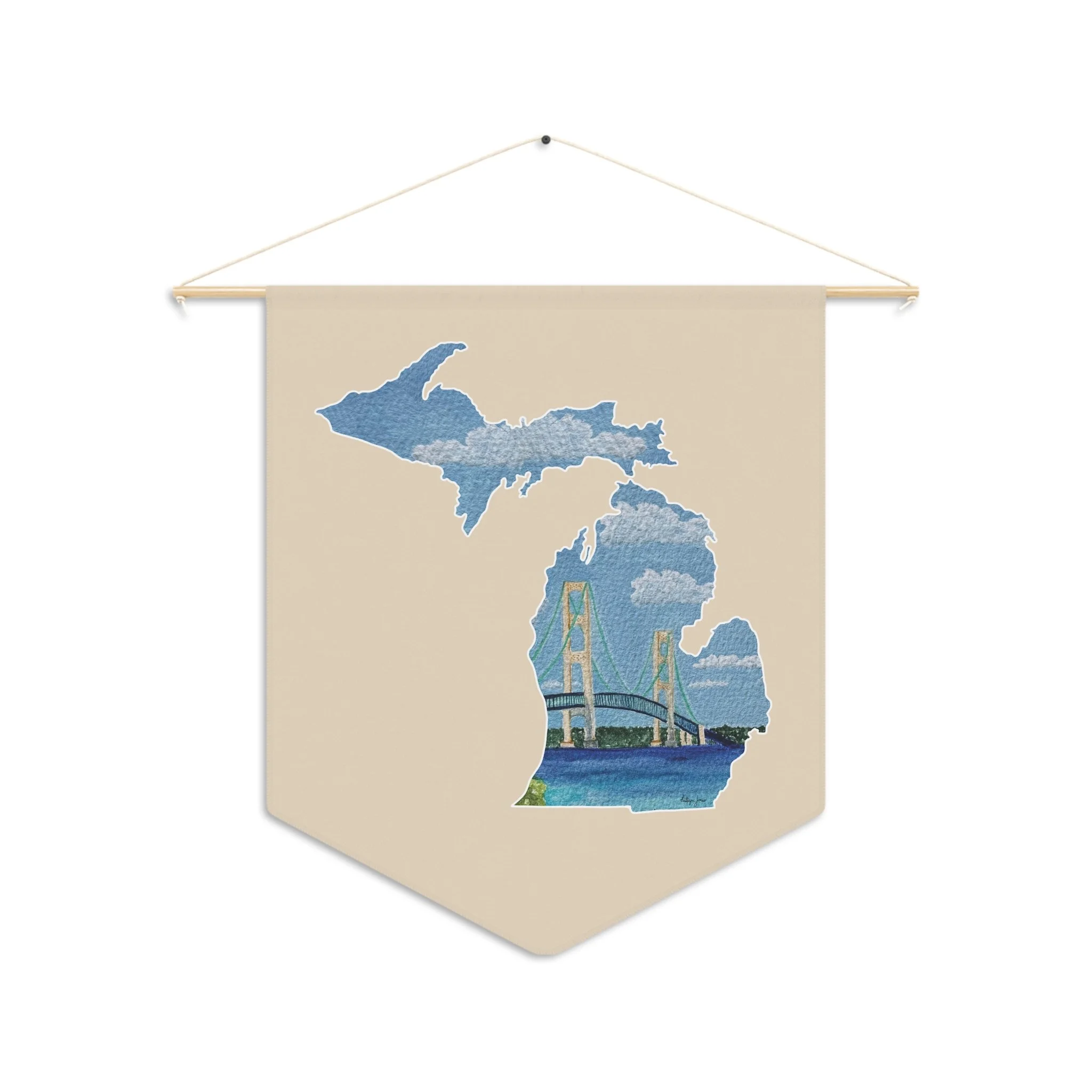 Bring a piece of Michigan home with this soft, sculptural pennant. The state silhouette frames a painterly scene — a sunlit suspension bridge and gentle lake waves — printed in rich, saturated inks that pop against the neutral background. Hang it on a hallway peg, above a reading nook, or in a cottage kitchen to add a quiet, coastal touch that reminds you of open water, harborside drives, and summer crossings. The wooden dowel and twine give it a handcrafted feel, while clean laser-cut edges keep the look modern and neat. It reads like a small, wearable memory of the lake state — subtle, personal, and ready to travel from cabin to city apartment.
